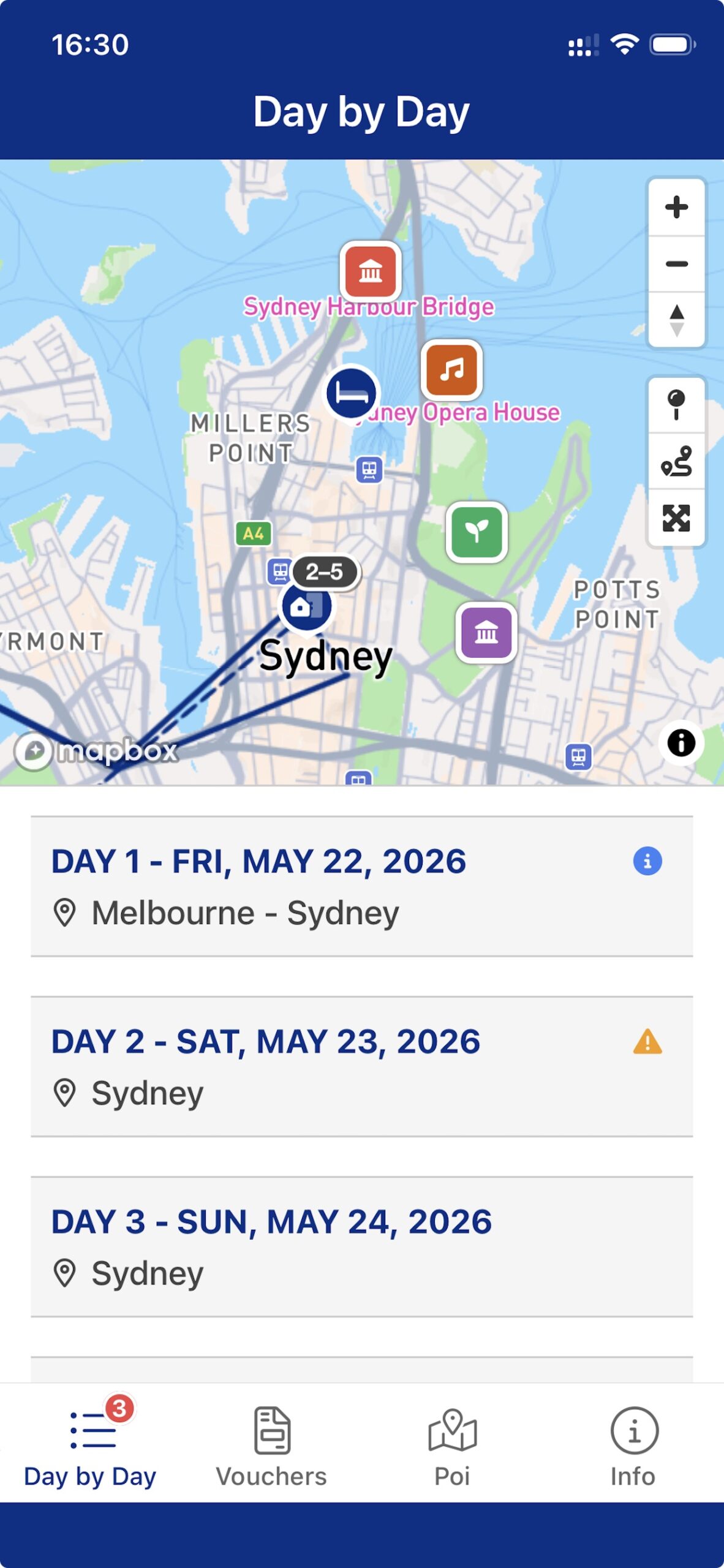 If your travel agent changes anything in your itinerary, the update arrives automatically the next time the app connects to the internet. A red badge on the Day by Day icon shows when there are new updates to review.