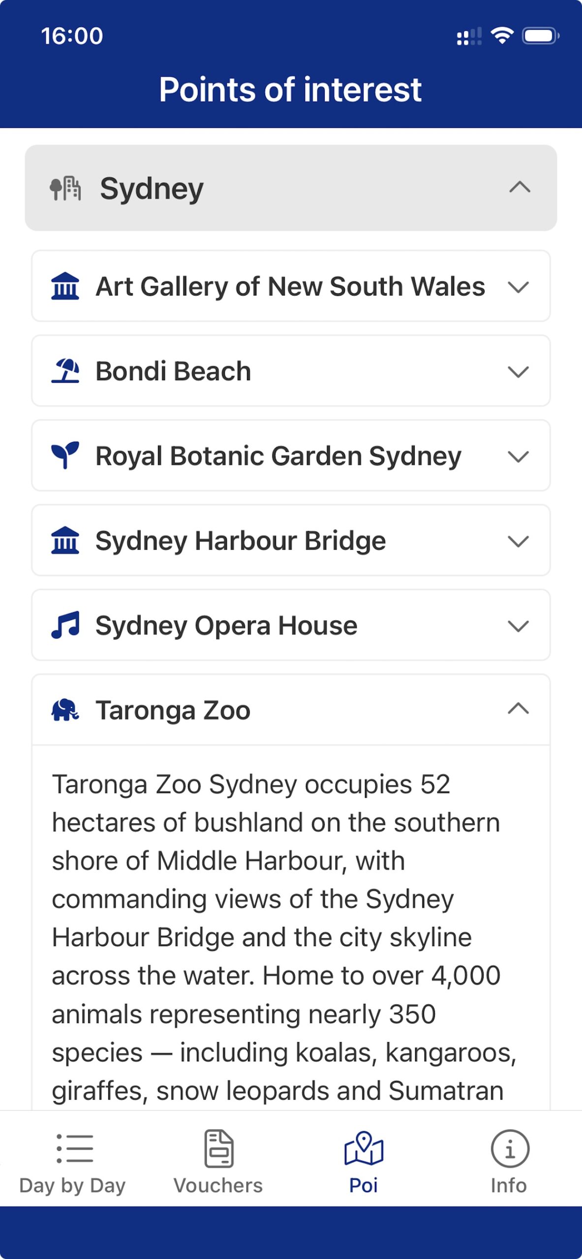 Each destination on your trip has a list of points of interest such as museums, landmarks, and beaches. Tap any item to read more and see its location on the map.